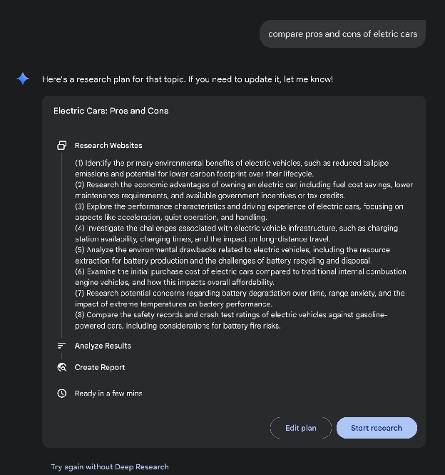 这些工具引入的一个基本转变是搜索过程本身的变化。标准搜索提供即时链接,将综合工作留给您。Deep Research 在不同的模型上运行。在这里,您为 AI 分配一个复杂的查询并授予它一个"时间预算"——通常是几分钟。作为这种耐心的回报,您会收到详细的报告。